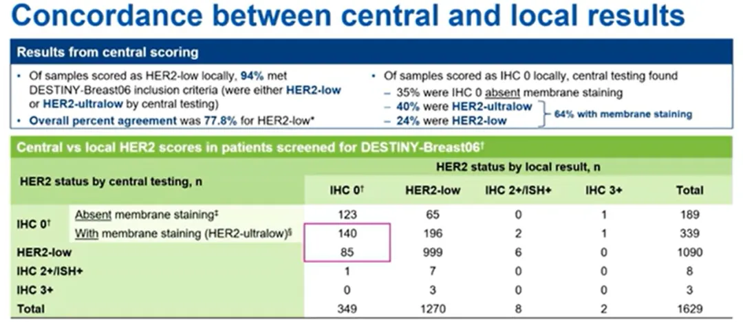 杨文涛教授:今年ASCO大会公布DB-06研究的疗效和安全性数据后,无论临床医生还是病理医生都非常期待更多病理报告的细节披露。本次ESMO大会上,Giuseppe Viale教授报告了该研究的病理数据(摘要号:LBA21)引起了大家的关注。该项报告显示无论是以原发灶还是转移灶检测结果入组、活检样本或切除标本入组、不同的标本年限等T-DXd治疗的获益相似。地方实验室诊断为HER2低表达的病例和中心实验室的一致性为77.8%。由于地方实验室并未对IHC 0中是否有细胞膜染色进行区分,故无法获得超低表达的一致性数据。在本项报告中尤其值得关注的是,地方实验室判定为IHC 0的349例患者中,有64%的患者在中心实验室重新判定为HER2低表达(24%)或HER2超低表达(40%),这意味着有将近三分之二的HER2零表达(IHC 0)乳腺癌实际上存在HER2低表达或超低表达,也是T-DXd治疗的潜在获益人群。这个数据对临床来说非常重要,一些IHC 0的晚期患者如果通过重新阅片、重新活检、重新检测,有可能被重新判定为HER2低表达或超低表达,从而获得T-DXd治疗的机会。