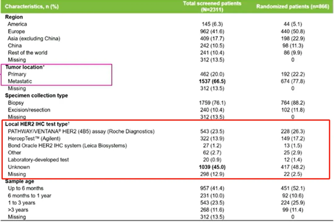 由于DB-06研究中地方实验室并未进一步判断IHC 0的病例是否为超低表达,因此这个”64%”的数据并不能简单地理解为地方实验室和中心实验室的不一致性,因为地方实验室报告的IHC 0的结果中也包含了所谓的超低表达。我本人也非常关注其中不一致的病例(如地方实验室为IHC 0而中心实验室为低表达的病例)是否有更多的相关数据。如是否与空间异质性相关(地方实验室和中心实验室检测的样本是否来自同一蜡块),或是由于不同的检测平台和检测抗体所导致,抑或由于病理医生判读的差异所导致,期待这些方面的更进一步数据。这次报告的DB-06病理结果中,还有一部分非常宝贵的数据,即其中有50%以上的患者具有地方实验室检测抗体和平台的相关信息。除了中心实验室所使用的VENTANA HER2(4B5)以外,还有其他检测平台和抗体,如Hercep Test(Dako AutoStainer)、Bond Oracle HER2 lHC(Leica Biosystems)等等。不同检测平台和中心实验室所采用的Ventana 4B5检测平台之间的一致性,以及与治疗的相关性数据是大家非常关注的。我始终认为哪个平台的检测结果与疗效更相关最重要,而不是哪一个平台能检测出更多的HER2低表达或超低表达。我们期待未来DB-06研究能够提供更多这方面的信息。