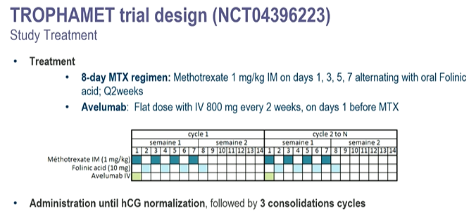 妊娠滋养细胞肿瘤(GTT)是年轻女性在怀孕期间患上的罕见肿瘤。在FIGO评分≤6的低风险GTT中,标准方案是8天甲氨蝶呤(MTX),已知可诱导约70%患者的人绒毛膜促性腺激素(hCG)正常化。免疫检查点抑制剂Avelumab在化疗耐药患者中有效(You,JCO 2020)。TROPHAMET试验的目的是观察联合Avelumab与8天MTX治疗是否可以提高疗效并助力根除低风险GTT。