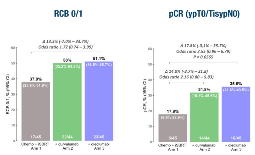 147名患者被随机分配,9名MP低风险,135名可用于ITT分析评估。在NACT+SBRT中添加PD-L1抑制剂(durvalumab)和腺苷靶向药物(oleclumab)后,残留癌症负荷(RCB)0-1(主要终点)和手术病理完全缓解(pCR)的比率在数值上都有所增加。在45名接受durvalumab和oleclumab以及NACT+SBRT的患者中,35.6%的患者实现了RCB 0(或pCR),而仅接受NACT和SBRT的45名患者中,这一比例为17.8%。