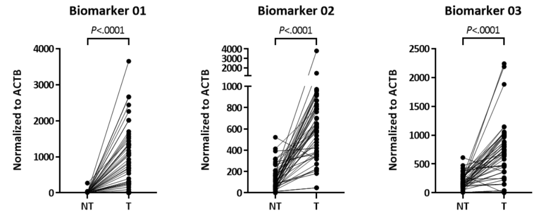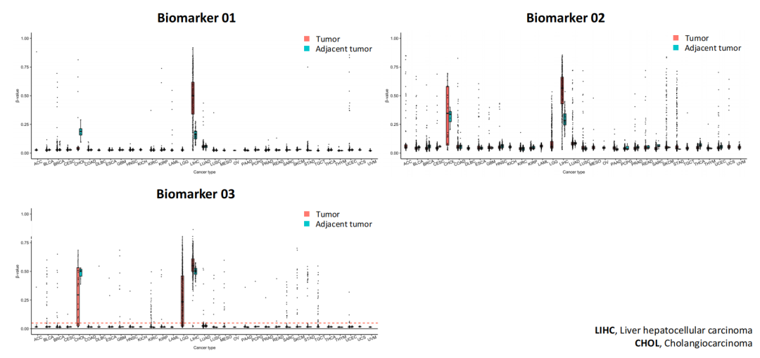 在组织验证中,生物标志物01和02在肝细胞癌肿瘤中的甲基化程度显著高于非肿瘤组织。生物标志物03在包括肿瘤和非肿瘤在内的肝脏组织中特异性甲基化,但与邻近的非肿瘤组织相比,在肝细胞癌肿瘤中的甲基化程度显著增加。在其他组织,包括肺、胃和结肠癌中,这些生物标志物几乎检测不到。
