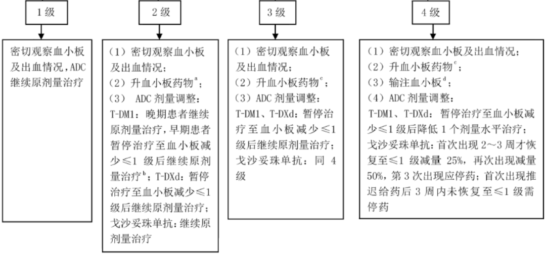 常用的治疗包括:血小板减少≥2级时给予重组人白介素-11(rhIL-11)或重组人血小板生成素(recombinant human thrombopoietin,rhTPO);当rhTPO或rhIL-11未能在下次T-DM1治疗前将血小板计数恢复到≤1级的情况下,可使用血小板生成素受体激动剂(TPO-RA)。
