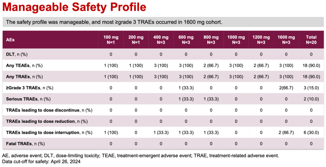 1200 mg被选为后续剂量扩展阶段的推荐剂量,后续研究将进一步评估其疗效和安全性。