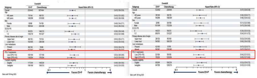 图2.EV-302/KEYNOTE-A39研究PFS(左)和OS(右)亚组分析