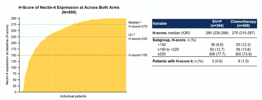 研究结果表明,在886例随机化患者中,有800例的Nectin-4表达可评估(EV+P组:n=394;化疗组:n=406);Nectin-4 H-评分偏向高表达,与la/mUC患者群体中的先前报告一致。EV+P组和化疗组的中位H-评分分别为280和270;分别有38例和50例患者H-评分<150(图4)。
