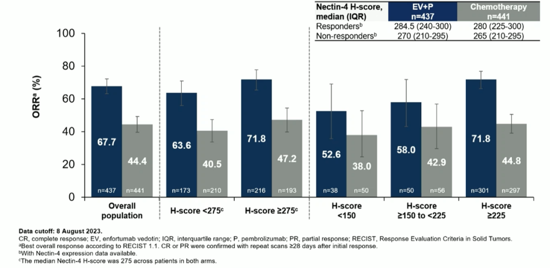 在EV+P组中,应答者和非应答者的Nectin-4表达中位H评分分别为284.5和270,ORR为67.7%;在化疗组中分别为280和265,ORR为44.4%(图6)。