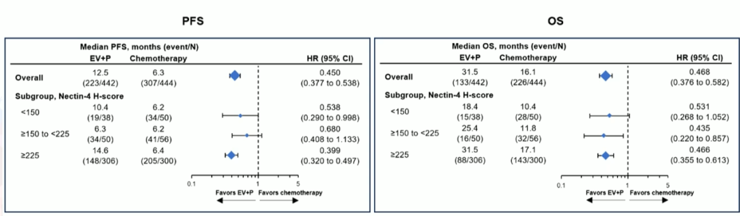 在H-评分亚组(≥225,≥150–<225,和<150)中,EV+P相比化疗的PFS的HR(95%CI)分别为0.40(0.32-0.50)、0.68(0.41-1.13)和0.54(0.29-1.00)。OS的HR分别为0.47(0.36-0.61)、0.44(0.22-0.86)和0.53(0.27-1.05),这表明无论Nectin-4表达水平如何,EV+P在各亚组中均表现出一致的无进展生存期和总生存期获益。