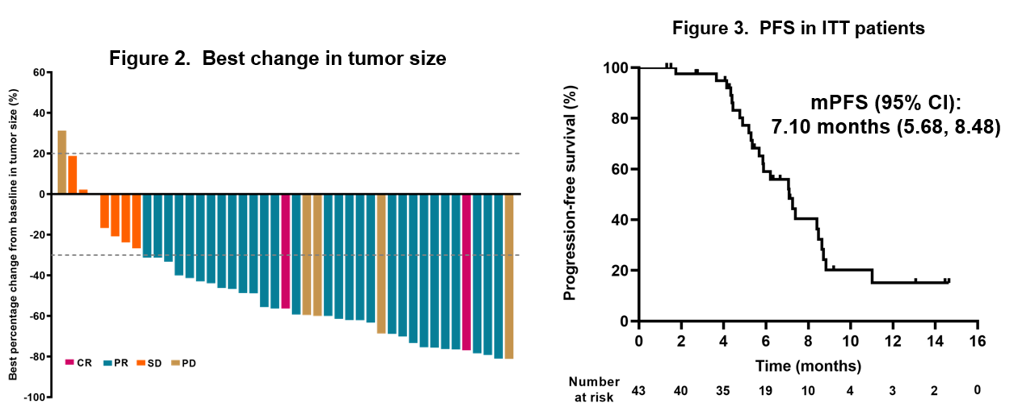本研究共纳入43例患者,中位年龄61岁,39.5%的患者PD-L1 CPS≥10,95.3%的患者有转移性疾病。全人群ORR为81.4%,DCR为97.7%,mPFS为7.10个月(图2),OS尚不成熟。
