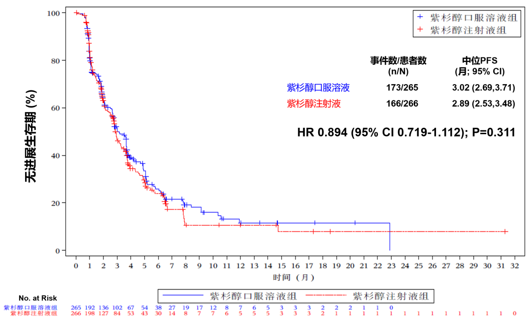 最终,本研究显示紫杉醇口服溶液较静脉紫杉醇注射液不仅在数值上改善了mPFS(3.02个月vs 2.89个月,HR 0.894,95%CI:0.719-1.112,P=0.311);