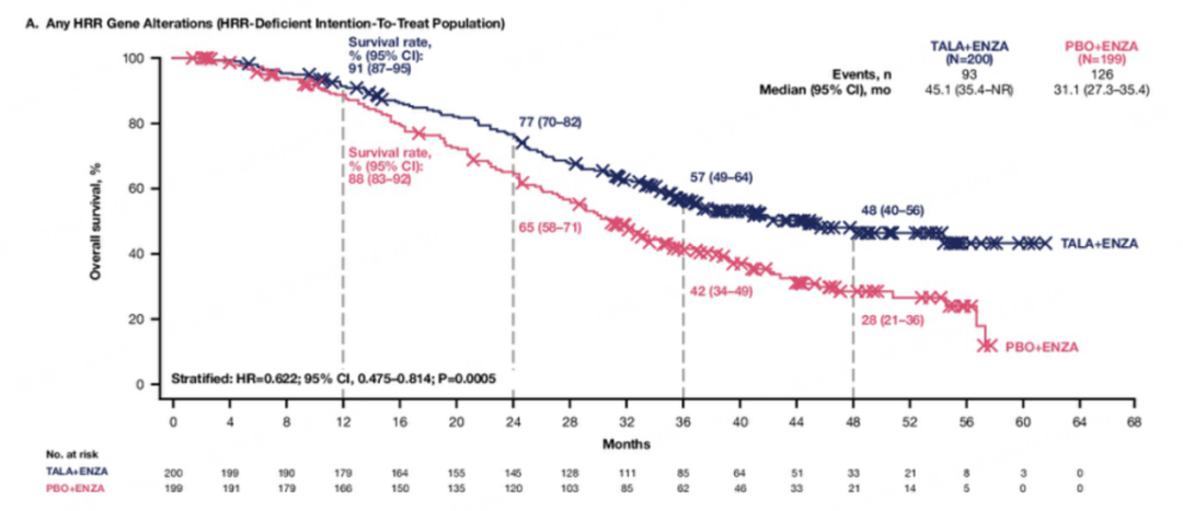 在HRRm人群中,他拉唑帕利联合恩扎卢胺vs安慰剂联合恩扎卢胺的中位OS分别为45.1个月vs 31.1个月(HR=0.622,P=0.0005)。