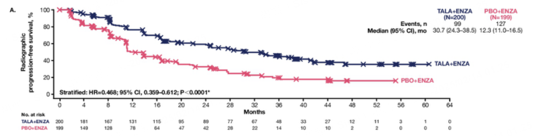 在HRRm人群中,他拉唑帕利联合恩扎卢胺的中位rPFS)为30.7个月,安慰剂联合恩扎卢胺组为12.3个月,降低了53%的影像学疾病进展或死亡风险(HR=0.468,P<0.0001)。