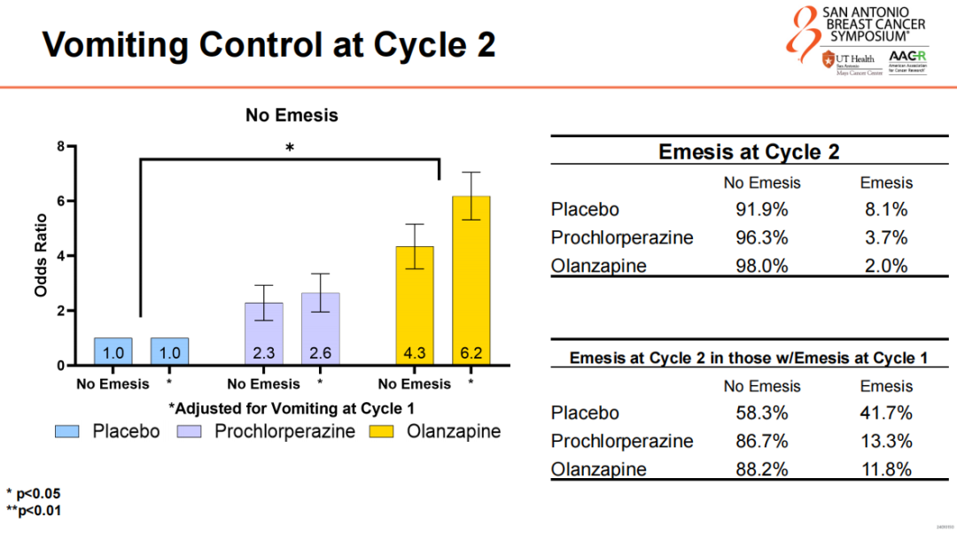 Prof.Luke Peppone:So in terms of safety profile,both of those drugs were excellent,and we had no serious adverse events related to the study intervention drugs,either olanzapine or prochlorperazine.We had a number of adverse events that were all expected.Olanzapine is known to cause sedation and some drowsiness,and those were the typical adverse events that we dealt with,similar with prochlorperazine,but nothing unexpected.And adverse events between the placebo and the study interventions were very similar.We’re still teasing apart those,but the safety profile of those two drugs in our study and in previous research are excellent,and that’s one of the many reasons why they were chosen,and we like using these drugs in these patients.