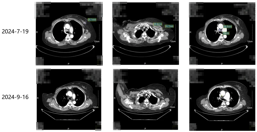 CT:左侧腋下多发肿大淋巴结,较前片部分有所缩小,纵膈淋巴结较前片稍增大。