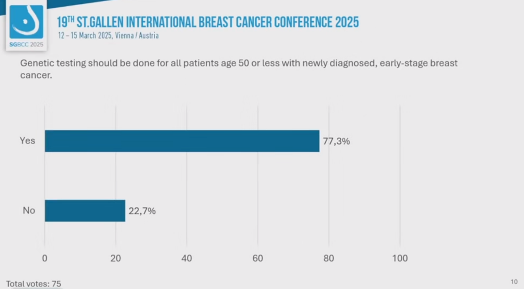 编者按:第19届St.Gallen国际乳腺癌大会(SGBCC 2025)于当地时间2025年3月12~15日在音乐之都维也纳举行。大会的最后一天,专家投票压轴登场。《肿瘤瞭望》整理了基因检测章节的专家投票,现成文如下,与大家一起感受早期乳腺癌治疗决策的圣加伦氛围。