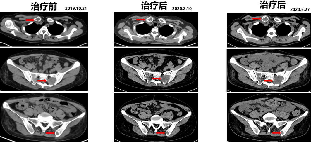 复查PET-CT:右侧锁骨、骶骨、及左侧髂骨局部骨质破坏并代谢活跃,考虑转移。