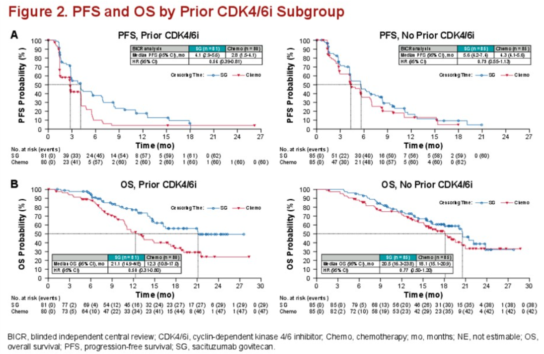 杨谨教授:如前所述,SG作为首款靶向Trop-2的ADC,具有良好的药物设计及作用机制。在HR+/HER2-晚期乳腺癌中,多项研究对CDK4/6i经治后耐药患者进行了探索,目前只有ADC取得了PFS及OS双重获益。