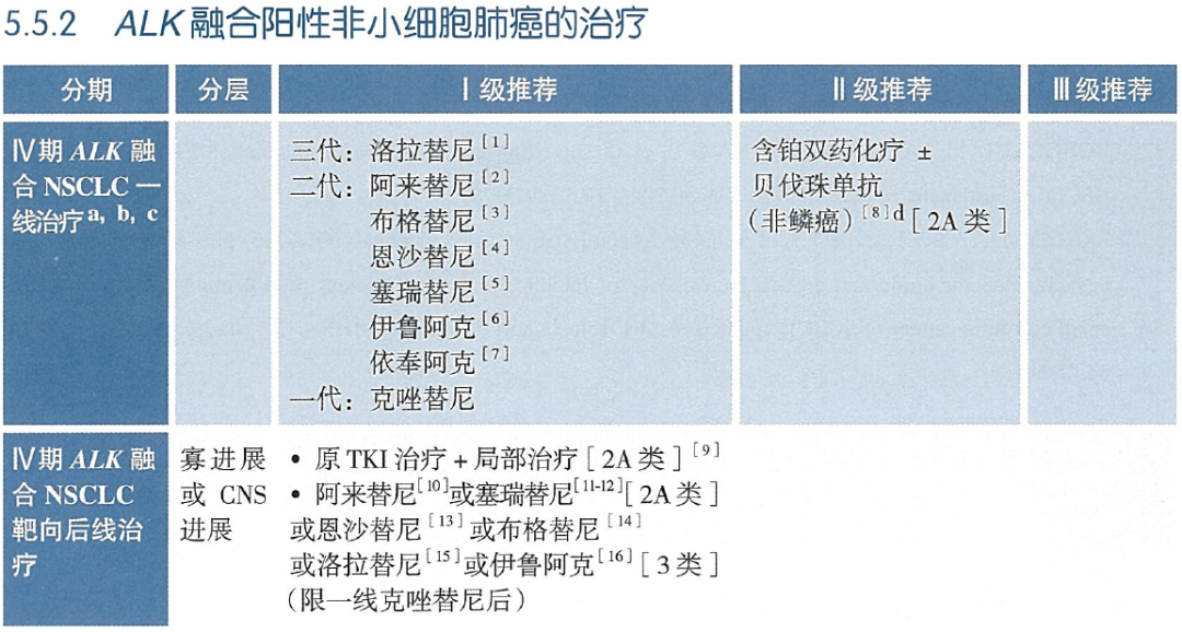 对于IV期ALK融合NSCLC靶向后线治疗:当广泛进展时,若为一代TKI一线治疗失败者,推荐伊鲁阿克(3类)。本条推荐更新了【注释】部分的循证医学证据。