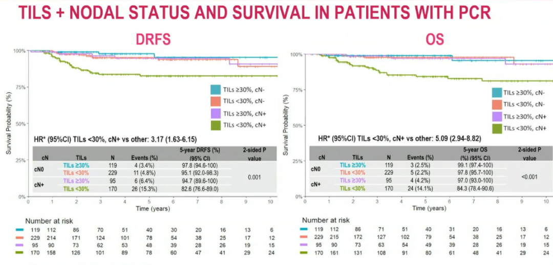 回顾性数据表明,即便达到病理完全缓解(pCR),基线肿瘤浸润淋巴细胞(TILs)水平低且伴有淋巴结受累的患者预后仍较差。2025年欧洲肿瘤内科学会(ESMO)乳腺癌年会上公布的一项回顾性研究发现,基线基质肿瘤浸润淋巴细胞(TILs)水平低和淋巴结受累能够预测出这样一类患者亚群:尽管从其他方面看似乎具有较好的长期预后,但他们仍有复发风险(摘要号:2O)。