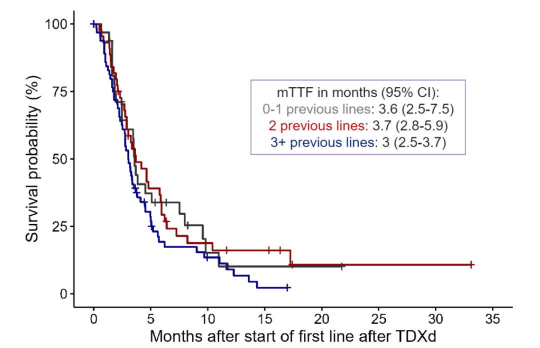 在T-DXd前接受过0-1线、2线、3+线治疗的亚组患者中,中位TTF分别为3.6、3.7、3.0个月。