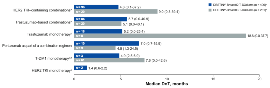 在DB-02研究中,后续治疗包括HER2 TKI联合治疗(n=96)、曲妥珠单抗联合治疗(n=84)、曲妥珠单抗单药治疗(n=18)、帕妥珠单抗联合治疗(n=10)、T-DM1单药治疗(n=3)、HER2 TKI单药治疗(n=2)其中位DoT分别为4.8、5.7、5.2、7.0、4.9个月、1.4个月;