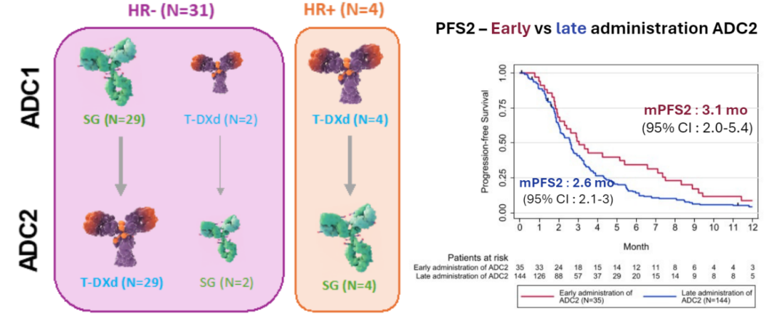 T-DXd和SG的载荷均为拓扑异构酶I(TOPO1)抑制剂,靶点分别为HER2和TROP-2。理论上,如果不存在TOPO1相关的耐药性,T-DXd和SG的序贯使用仍然有效。本次ESMO BC大会报道了另一项来自法国的回顾性研究[9],纳入了179例接受T-DXd或戈沙妥珠单抗(SG)治疗的HER2低表达mBC患者。研究结果显示,这两种ADC序贯治疗患者的疗效有限,总体人群的mFPS2仅为2.7个月。值得注意的是:早期(≤3线)使用第二种ADC(ADC2)的mPFS2仅为3.1个月,和延迟(3线以后)使用ADC2(2.6个月)仅相差0.5个月,且早期使用ADC2的原发耐药率高达55.9%;此外,有62例患者明确中间使用了其他治疗药物,总体的中位无进展间隔期(mPFI)为2.6个月,其中艾立布林治疗患者的中位PFI1为3.5个月。这些结果表明不同ADC序贯治疗需注意靶点丢失或载荷耐药问题,间隔使用其他机制的药物似乎有助于改善生存预后。