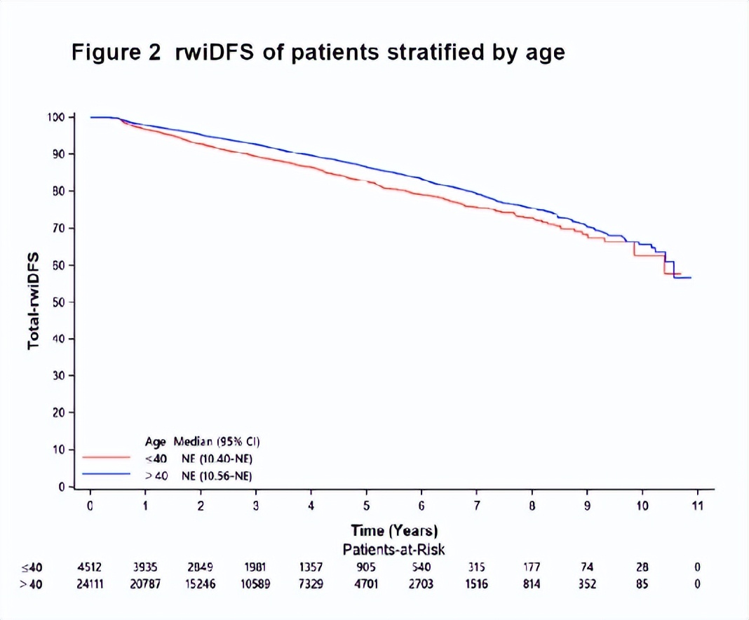 在这项真实世界研究中,观察到年轻的HR+/HER2-早期乳腺癌患者预后较差。并且年轻(≤40岁)是一个重要的独立风险因素,与HR+/HER2-早期乳腺癌患者复发或死亡风险显著升高相关。