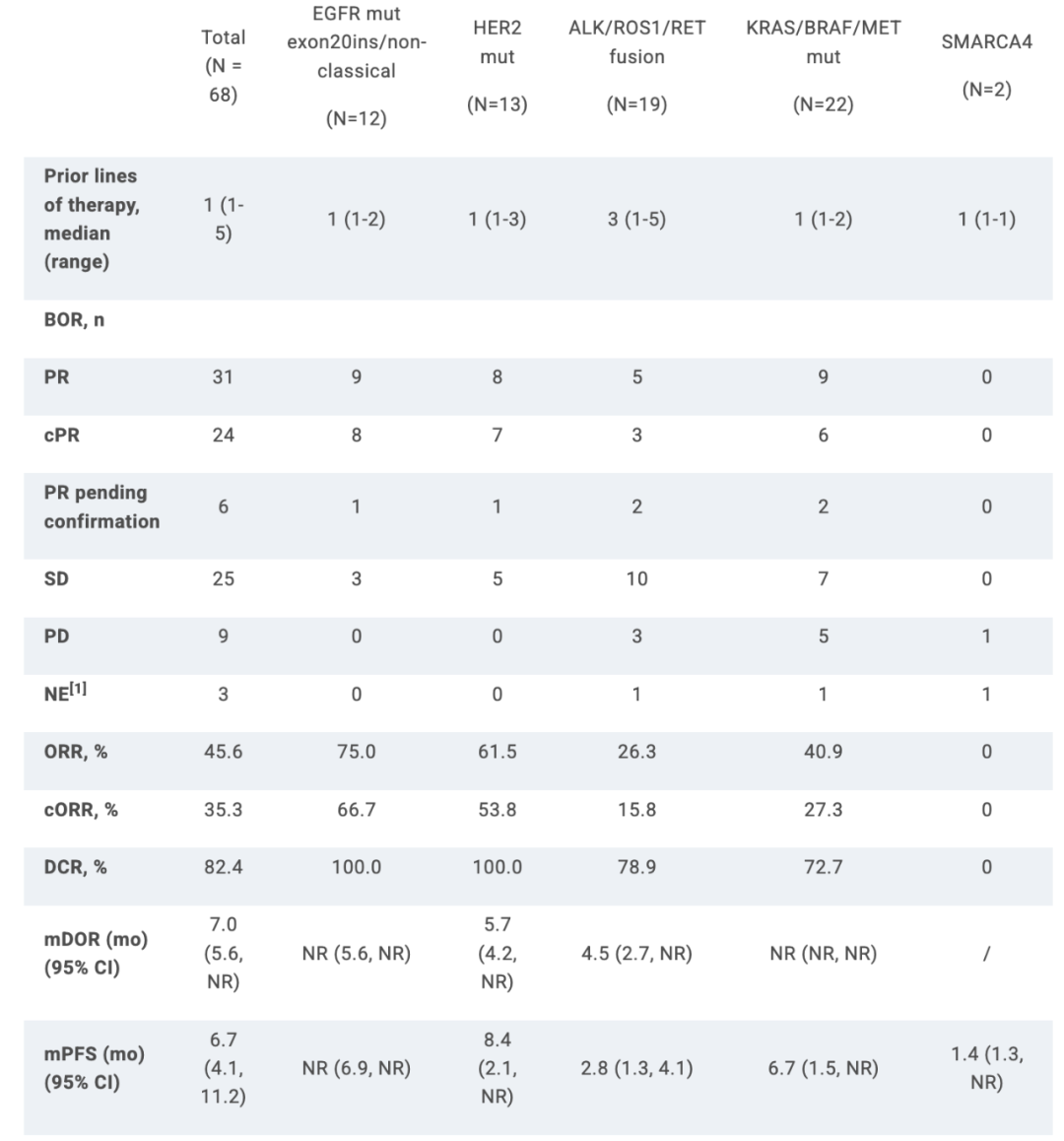 截至2024年12月5日,共纳入73例具有上述基因异常的NSCLC患者。5例患者仍在接受治疗,但因基线后首次扫描随访不足而被排除在分析之外。在7例EGFR外显子20插入患者中,85.7%(6/7)达到确认的部分缓解(cPR)。在8例KRAS G12C突变患者中,观察到3例确认的部分缓解(cPR)和1例待确认的部分缓解(PR)。