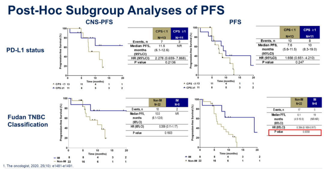 李婷教授:在我们的临床研究中,仅入组了35例患者。针对这35例患者,我们分析了她们的CPS评分以及是否为免疫调节亚型。初步观察发现,CPS≥1和免疫调节亚型患者的疗效在数值上显示略高。然而,由于该研究样本量较小,且两组间的差异并不显著,因此目前尚不清楚具体的生物标志物,这也是我们未来研究的方向之一。在之后设计的临床研究中,我们也有针对三阴性乳腺癌脑转移的相关研究,届时将探索更全面的生物标志物,其中可能包括通过收集患者的脑脊液、血液和组织标本进行联合生物标志物测定。我想,未来的临床研究数据或许能更清晰的回答这个问题。
