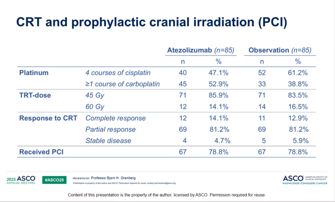 阿替利珠单抗组与观察组的CRT客观缓解率(ORR)相近(分别为95%和94%),两组各67%的患者接受了PCI。