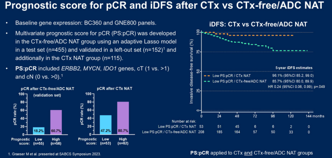 运用BC360和GNE800检测方法,并进行多因素确定预后评分(PS:pCR),CTx-free/ADC NAT组中pCR者的预后评分low PS:pCR占18.2%,high PS:pCR占60.7%;CTx组中pCR的患者预后评分low PS:pCR占47.2%,high PS:pCR占80.7%。根据预后评分PS:pCR来分组分析iDFS,可以观察到:low PS:pCR组中,CTx组的5年估计iDFS为96.1%(95%CI:85.2-99.0),CTx-free/ADC NAT组的5年估计iDFS为85.7%(95%CI:80.0-89.9)。high PS:pCR组中,CTx组的5年估计iDFS为95.0%(95%CI:85.4-98.4),CTx-free/ADC NAT组的5年估计iDFS为94.3%(95%CI:89.6-96.9)。