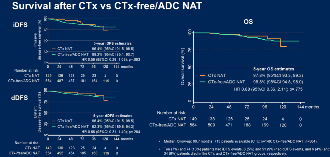 713例患者(CTx组:n=149;CTx-free/ADC NAT组:n=564)的中位随访时间为60.7个月。CTx组和CTx-free/NAT组分别有10例(7%)和74例(13%)患者发生iDFS事件,8例(5%)和51例(9%)患者发生dDFS事件,6例(4%)和34例(6%)患者死亡。CTx组和CTx-free/ADC NAT组5年OS率分别为97.8%(95%CI:93.3-99.3)和96.8%(95%CI:94.8-98.0)(HR 0.88;95%CI:0.36-2.11;P=0.775),5年iDFS率分别为96.4%(95%CI:91.5-98.5)和88.2%(95%CI:85.1-90.7)(HR 0.56;95%CI:0.29-1.08;P=0.083)。