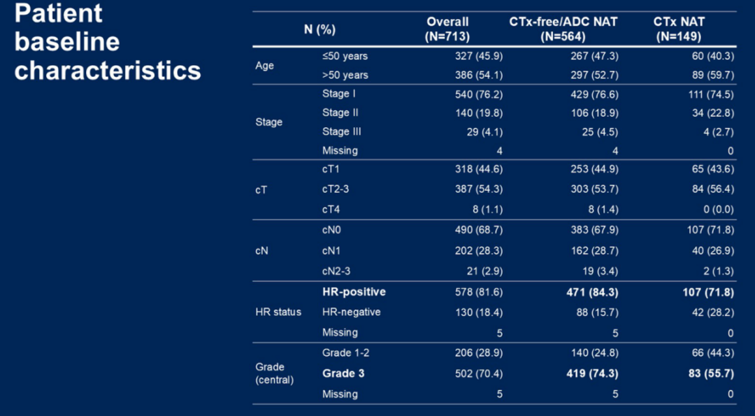 WSG的这三项试验均是比较短周期新辅助化疗替代标准周期化疗方案的疗效,本次汇总分析运用了以上三项试验组的患者(共713例)数据,将患者分为CTx组即化疗组,和CTx-free/ADC NCT组即非化疗/使用ADC药物新辅助化疗组,比较两组间的疗效。病理完全缓解(pCR,即ypT0/is ypN0)的患者允许省去进一步的全身化疗;非pCR患者必须接受全身化疗。pCR是每项RCT的主要终点;生存期(OS)是次要终点。研究者采用Kaplan-Meier法和Cox回归对患者进行生存分析。