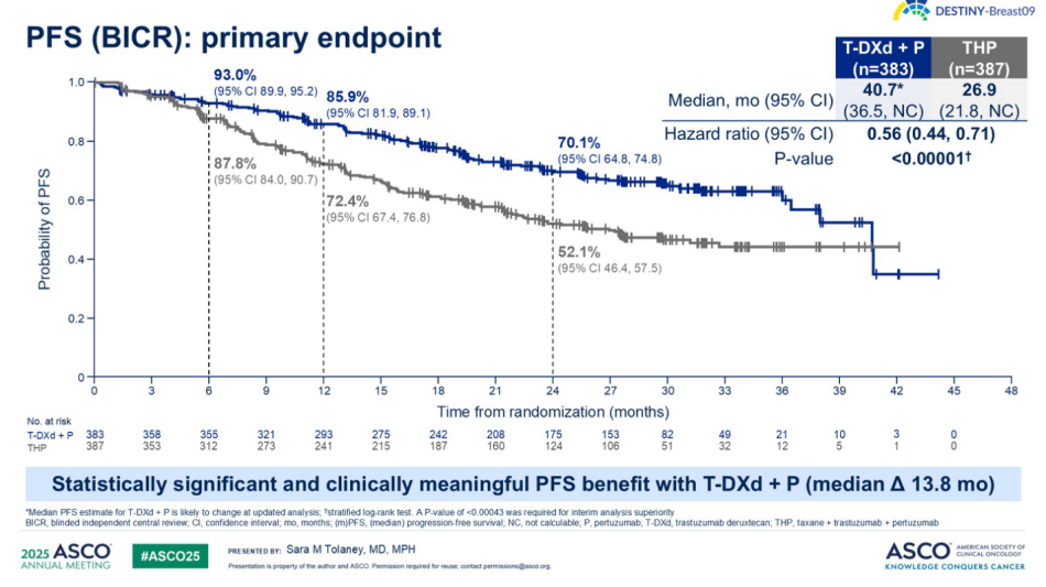 2025年ASCO大会重磅揭晓的全球多中心Ⅲ期DB-09研究,成功挑战了HER2阳性晚期乳腺癌当前一线治疗标准THP方案。研究结果超出预期,无论是在总体疗效、风险比还是各亚组分析结果方面,都展现了优异的临床获益。结果显示,T-DXd/DS-8201a联合帕妥珠单抗组的中位无进展生存期(PFS)达到40.7个月,较THP方案显著降低44%的疾病进展或死亡风险。该研究结果意义重大,将T-DXd从后线治疗推进到一线治疗,将对临床实践产生重要影响,未来在经济条件允许的情况下,可能会有更多患者在一线治疗中考虑使用T-DXd。