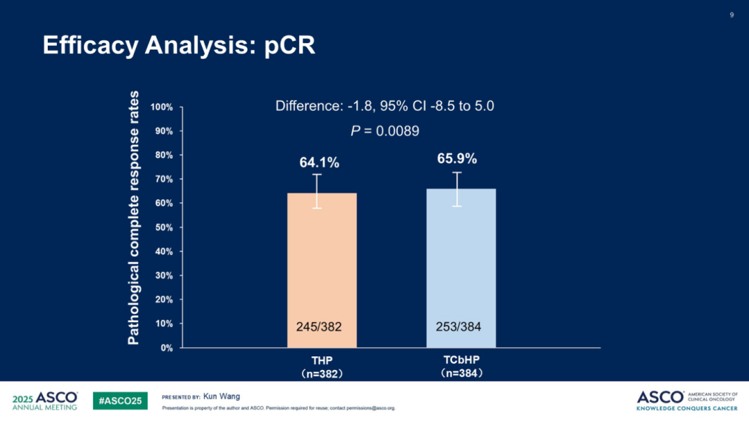 在主要研究终点方面,THP组245例(64.1%,95%CI59.2-68.8)患者达到病理完全缓解(pCR),TCbHP组253例(65.9%,95%CI61.0-70.5)患者达到pCR,绝对差异-1.8%,95%CI-8.5-5.0;优势比(OR)0.93,95%CI0.69-1.25;p=0.0089,表明THP在pCR率上非劣效于TCbHP。进一步根据激素受体状态进行分层,在ER-/PR-亚组中,THP组和TCbHP组的pCR率分别达到了78.2%和77.8%;在ER+/PR+亚组中,两组pCR率分别为55.8%和58.8%,无显著差异,其他各亚组分析结果也基本一致。上述研究结果提示,“去卡铂”降阶梯THP方案是一种安全有效的新辅助治疗策略,对于临床中对卡铂耐受性较差或预期对靶向治疗反应良好的患者,这一研究结果为考虑去除铂类药物提供了依据。