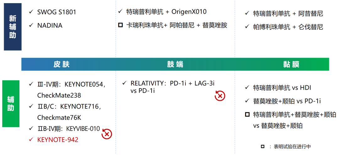 上述KEYNOTE054、CheckMate238、KEYNOTE716、CheckMate76K研究均为欧美国家主导的全球多中心研究,纳入患者以皮肤型黑色素瘤为主,单免疫仍是当前辅助免疫治疗标准,但免疫联合治疗的获益仍有待观察。