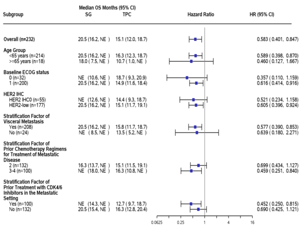 在OS方面,戈沙妥珠单抗较TPC同样取得了有临床意义的改善,为20.5个月vs 15.1个月,HR 0.583(95%CI:0.401-0.847),降低了41.7%的死亡风险,较全人群降低死亡风险程度具有更大获益的趋势。亚组分析显示,年龄<65岁、基线ECOG评分1分、HER2低表达、存在内脏转移、转移性阶段前序化疗3-4线患者、CDK4/6i经治患者显示了更大的OS获益趋势。