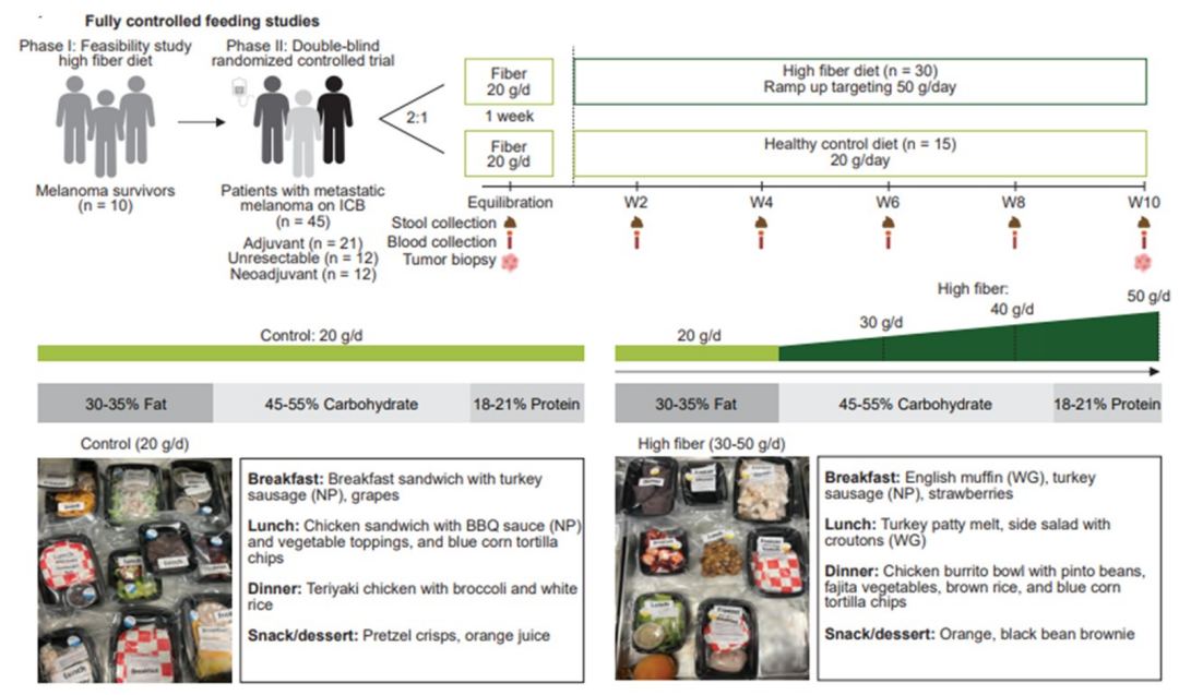 MD Anderson开展的一项1/2期随机对照DIET试验探索了高膳食纤维饮食(HFDI,每日50g)对黑色素瘤患者免疫治疗疗效的影响。中位随访22.6个月显示:在新辅助/晚期治疗队列(n=20)中,HFDI组的ORR是对照组的2倍之多(77%vs 29%),且新辅助HFDI组无一例复发;在辅助治疗队列(n=19)中,HFDI组复发率14%vs对照组33%。安全性方面,HFDI组3-4级毒性发生率与对照组无明显差异(P=0.465),但显著改善了皮疹和皮肤瘙痒症状。