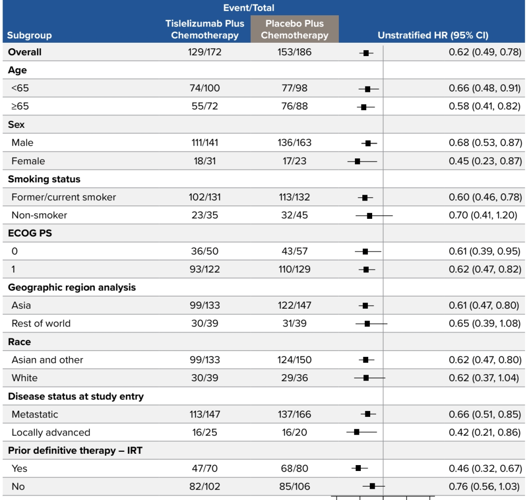RATIONALE-306研究亚组的森林图(图4)数据显示,替雷利珠单抗联合化疗组在PD-L1 TAP≥5%ESCC患者的各个亚组中,均能取得生存获益。其中,在吸烟人群、亚洲人群、既往放疗人群中可能取得更多获益。