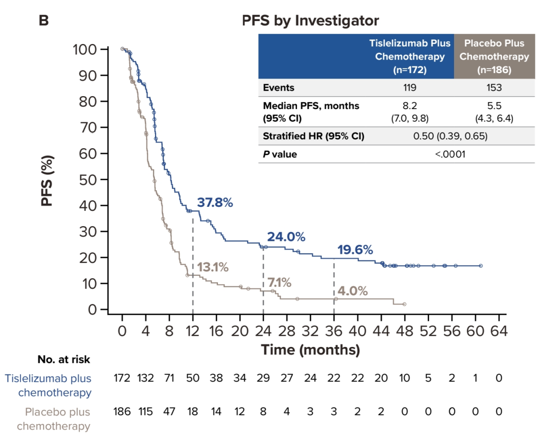 与安慰剂联合化疗组相比,替雷利珠单抗联合化疗组在OS和PFS方面均观察到显著改善,且OS获益在所有亚组中均表现一致。替雷利珠单抗联合化疗组mOS达19.1个月,较对照组(10.0个月)延长9.1个月,死亡风险降低39%(HR=0.61,95%CI 0.48-0.78,P<0.0001)(图2);替雷利珠单抗联合化疗组mPFS为8.2个月,较对照组(5.5个月)延长2.7个月,疾病进展或死亡风险降低50%(HR=0.50,95%CI 0.39-0.65,P<0.0001)(图3);两组早期生存曲线分离明显,且呈现持续分离状态,提示替雷利珠单抗联合化疗早期即可取得获益,并可持续维持。