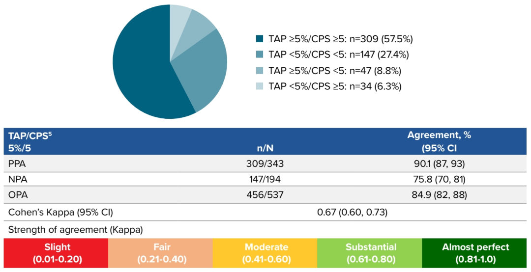 TAP 5%与CPS 5分阈值的一致性分析显示(图5),两种评分系统的总体符合率(OPA)达84.9%,其中阳性符合率(PPA)90.1%(309/343),阴性符合率(NPA)75.8%(147/194),Kappa系数为0.67(95%CI 0.60-0.73),表明两者达到高度一致(Substantial agreement)标准。该分析证实TAP与CPS在界定PD-L1高表达时具有高度互换性,从而支持使用TAP评分替换CPS评分作为替雷利珠单抗治疗的决策标准。