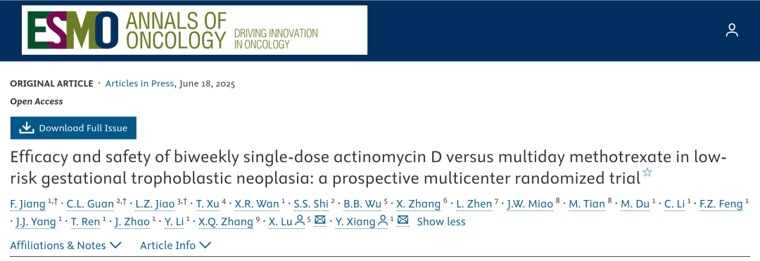 Ann Oncol丨向阳教授团队证实双周单剂量放线菌素D或多日甲氨蝶呤治疗低危滋养细胞瘤的疗效及安全性