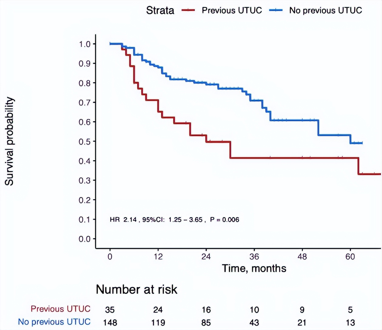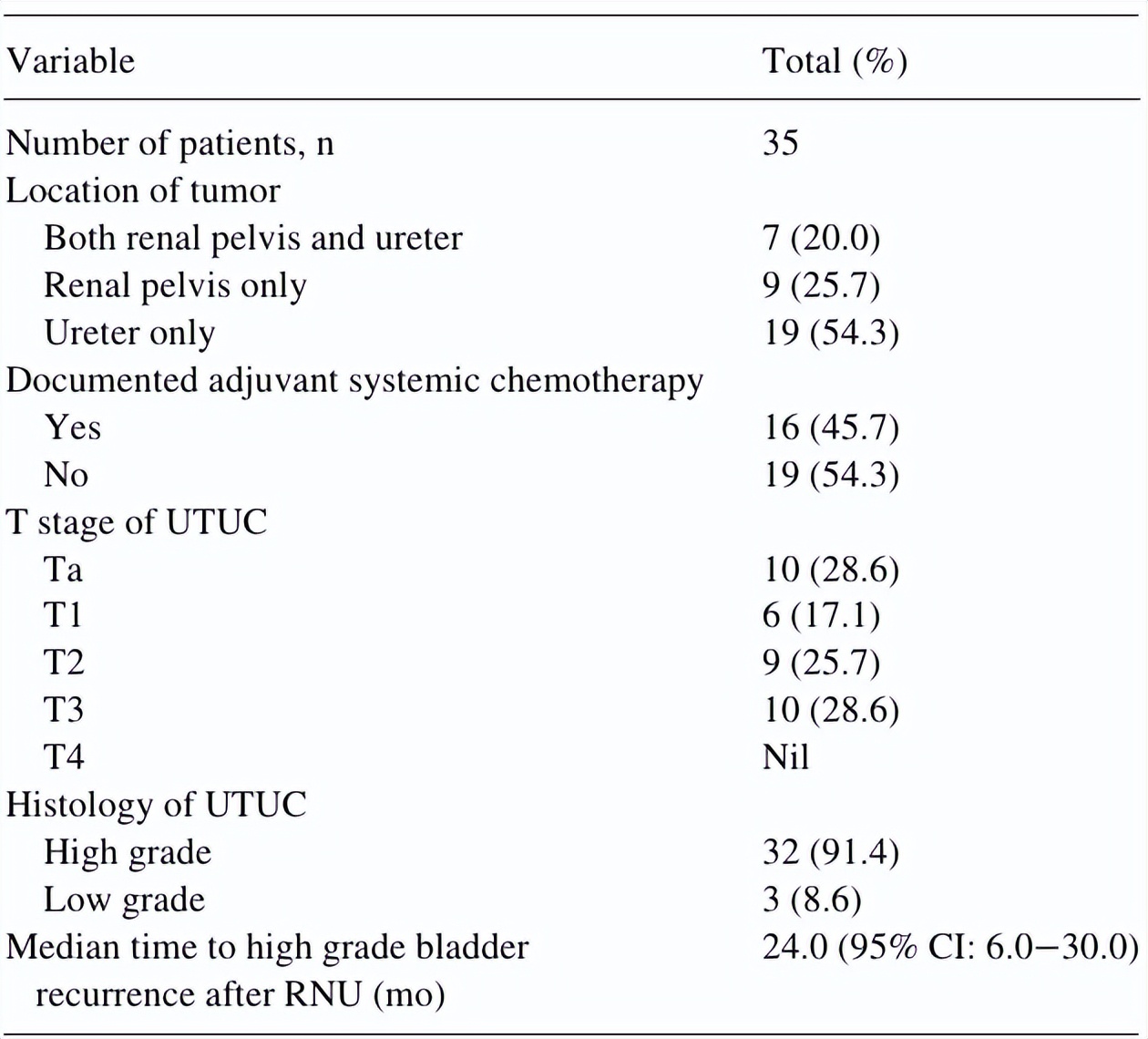 在183例确诊为HG NMIBC的患者中,有35例(19.1%)既往接受过UTUC治疗,并接受过根治性肾输尿管切除术(RNU),且切缘阴性。在异时性NMIBC亚组中,高危患者复发的中位时间为RNU后24个月。异时性NMIBC亚组包括25名男性和10名女性,平均年龄为75.0岁;而原发性NMIBC亚组包括113名男性和35名女性,平均年龄相似,均为77.02岁。
