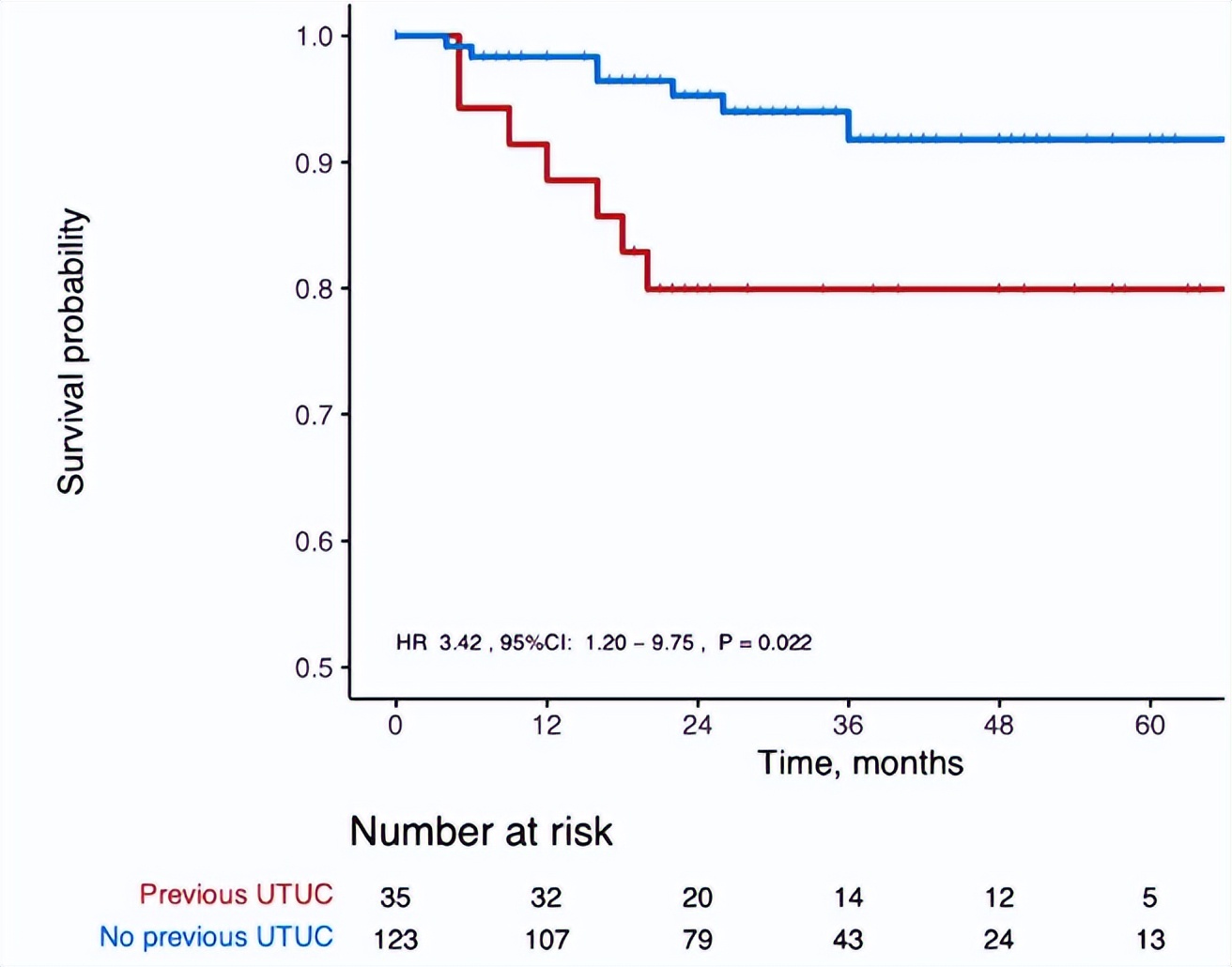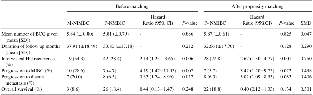 在非匹配分析中,异时性NMIBC与膀胱内高危复发风险增加相关,多变量分析显示,异时性NMIBC亚组复发率为54.3%,而原发NMIBC亚组复发率为28.4%(P=0.012,HR 3.12)。组间复发平均时间相似(异时性NMIBC亚组为11.2个月,原发NMIBC亚组为13.2个月,P=0.548)。除了既往UTUC病史外,多变量分析显示,其他复发高危因素包括EAU风险评分高(P=0.047,HR 2.84)和未能继续维持BCG治疗长达6个月(P=0.009,HR 5.49)。此外,异时性NMIBC亚组中有10例患者(28.6%)最终进展为MIBC,显著高于原发NMIBC亚组,后者仅有7例患者(4.7%)出现疾病进展(P=0.007,HR 4.19)。异时性NMIBC亚组也显示出更高的远处转移进展率(20%vs.6.5%,P=0.017,HR 3.33)。在非倾向匹配分析中,总生存率无显著差异(8.6%vs.18.4%,P=0.248,HR 0.44)。