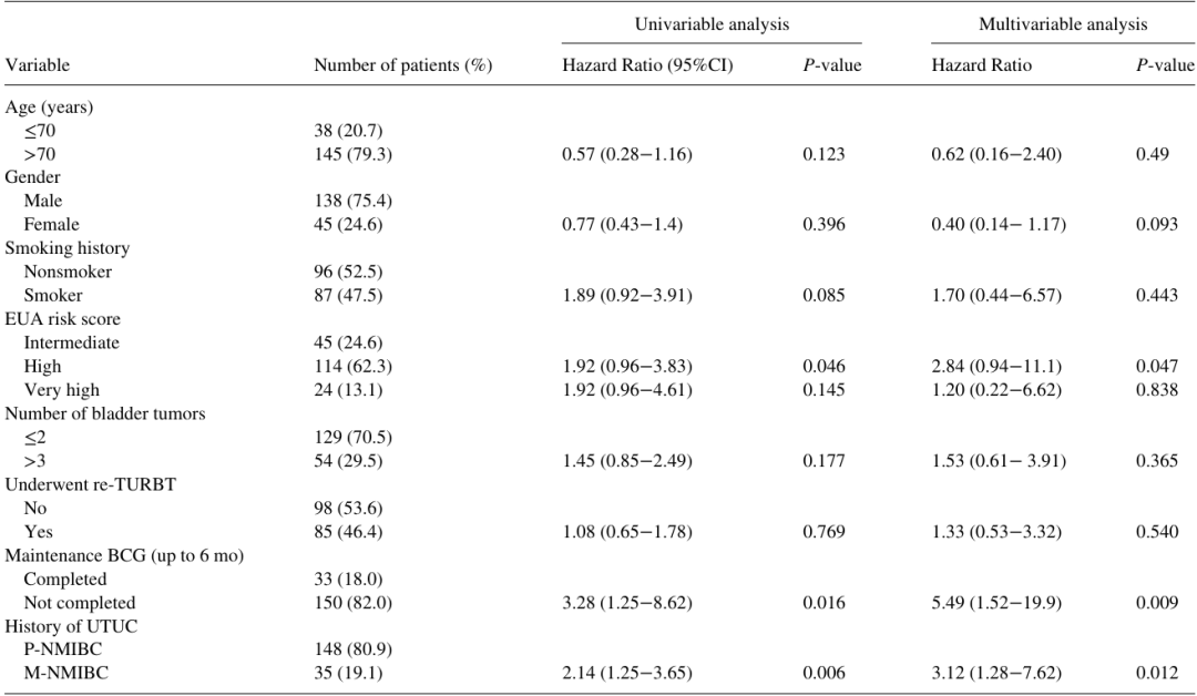 ▽BCG治疗后高危NMIBC复发的单变量和多变量分析