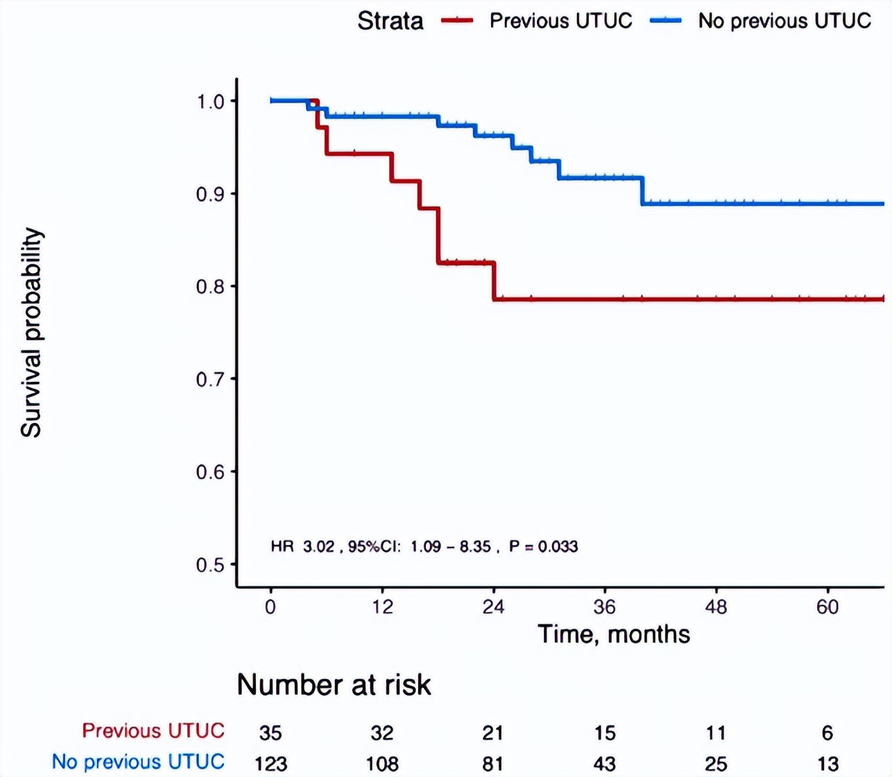 △未调整NMIBC患者进展为MIBC的生存Kaplan-Meier分析(未进行倾向评分匹配)