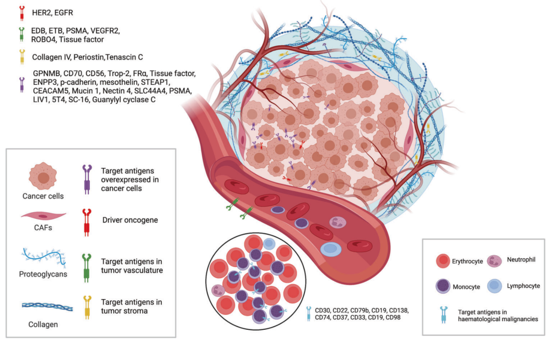 △ADC的关键靶标抗原主要来源于肿瘤细胞(过表达基因及驱动基因相关抗原)和肿瘤微环境(血管系统和间质组织)(图源:参考文献[1])