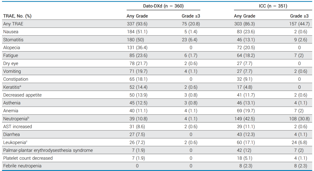 TB-01研究中Dato-DXd表现了非常好的治疗安全性和耐受性,总体的≥3级TRAEs发生率不到化疗组的一半(20.8%vs 44.7%),导致治疗中断(12%vs 25%)和减剂量(21%vs 30%)的TRAEs发生率也都低于化疗组。其中,Dato-DXd组≥3级的中性粒细胞减少症发生率仅为1.1%,相较于化疗组的30.8%降低了将近30倍;另外,眼毒性、口腔炎是目前TROP2 ADC较为受关注的特殊不良事件,但在TB-01研究中,Dato-DXd组这些特殊不良事件的发生率非常低,≥3级的干眼症、口腔炎等特殊不良事件发生率仅为1%~6%不等。中国队列的安全性数据总体上与全球患者一致。