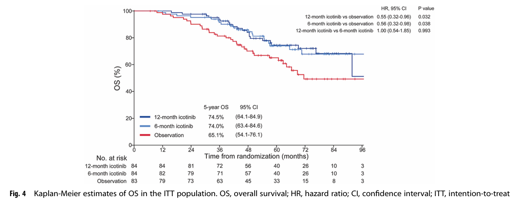 2)总生存(OS)获益明确:12个月组和6个月组的5年OS率分别为74.5%和74.0%,明显优于观察组的65.1%,死亡风险降低约45%。