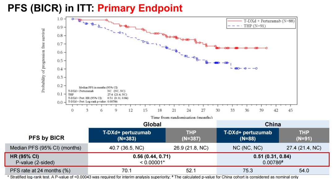 具体而言,在全球数据中,盲态独立中心评估(BICR)意向性治疗人群中,T-DXd+P组患者取得超过40个月的超长中位PFS,相较于传统标准治疗THP(曲妥珠单抗+帕妥珠单抗+紫杉类)组延长13.8个月,疾病进展或死亡风险显著降低44%(40.7 vs 26.9个月,HR 0.56,95%CI:0.44~0.71,P<0.00001),且不同亚组患者显示了一致的倾向于T-DXd+P组的PFS获益趋势。