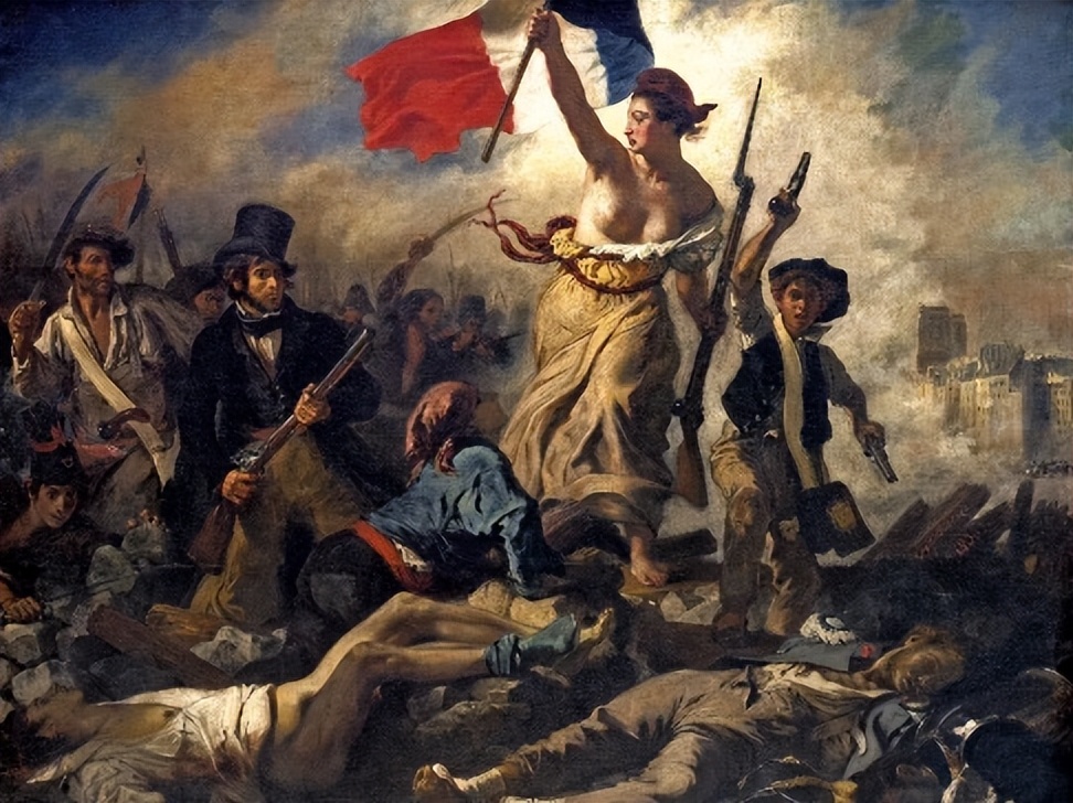 《自由引导人民》,德拉克洛瓦(1830),现藏卢浮宫博物馆。画面在七月革命背景下,以自由女神引领民众跨越街垒为核心,炽热色调与奔放笔触赋予革命事件以寓言般的崇高感。图片来源:Louvre Museum